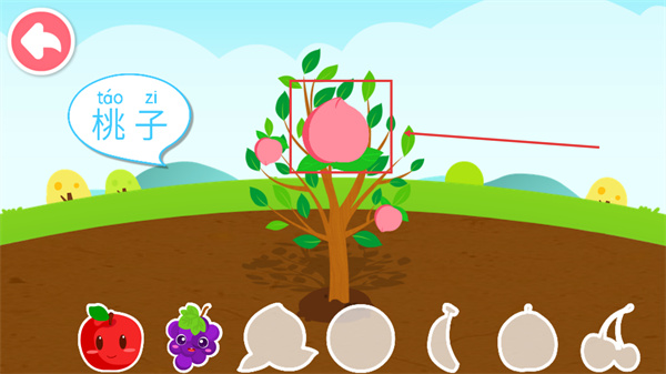 3、根据左侧蓝色对话框的【táo-zi-桃子】拼音和汉字提示,找到并采摘【桃子】。