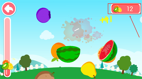 4、在切水果游戏中,旁边的数字【12】表示当前得分,切的越多分数越高。