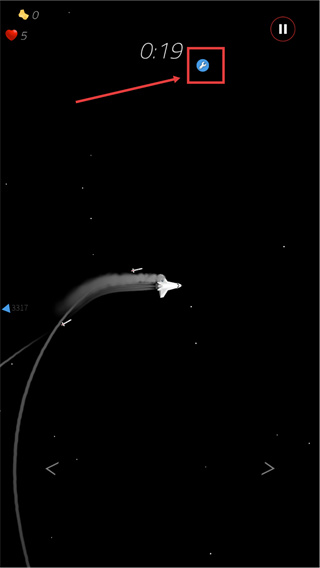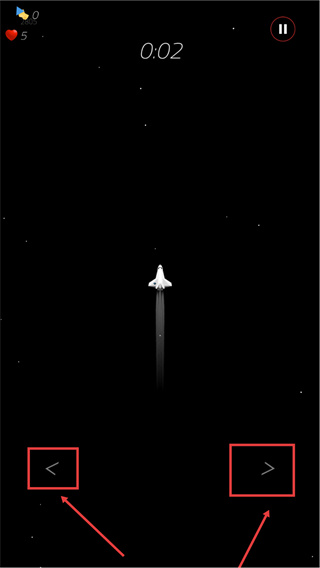 2、通过左右方向按钮控制火箭移动,躲避太空障碍物,同时留意顶部的计时进度推进关卡。