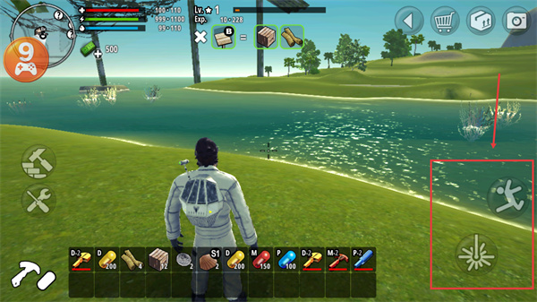 1、右侧功能按钮控制角色移动,同时收集道具提升资源储备,推进生存进度。