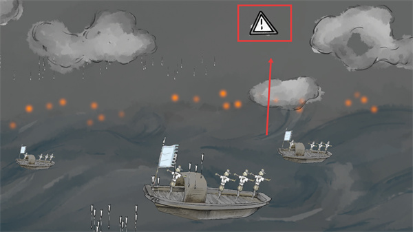 1、出现【!】警示标识时,需警惕敌方攻击,操控船只规避危险,同时准备利用己方单位进行防御反击。