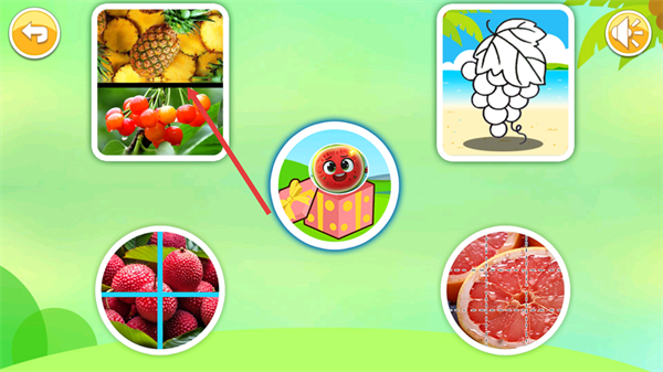 1、点击界面中的水果图片进入对应玩法,通过切水果或上色帮助孩子认知水果的形状与颜色,提升动手能力。
