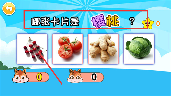 2、识别【樱桃】卡片,在选项中点击正确的樱桃图片,可得分并帮助孩子区分水果与蔬菜的不同特征。