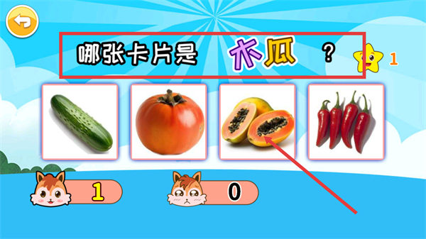 3、找到【木瓜】卡片,点击选项中正确的木瓜图片,能提升孩子对水果特征的认知,积累游戏分数。