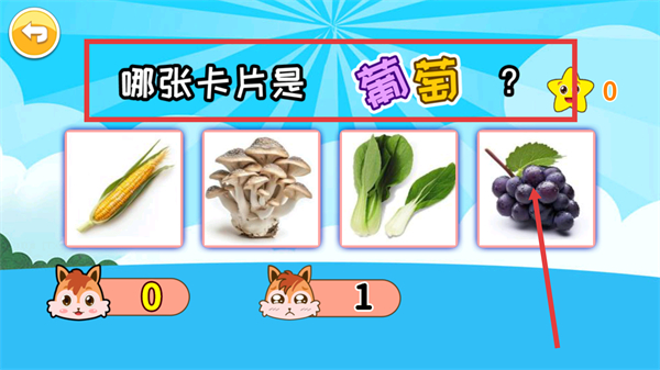 4、识别【葡萄】卡片,在选项里点击正确的葡萄图片,可得分且加深孩子对水果的认识,了解其外形特点。