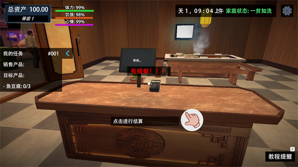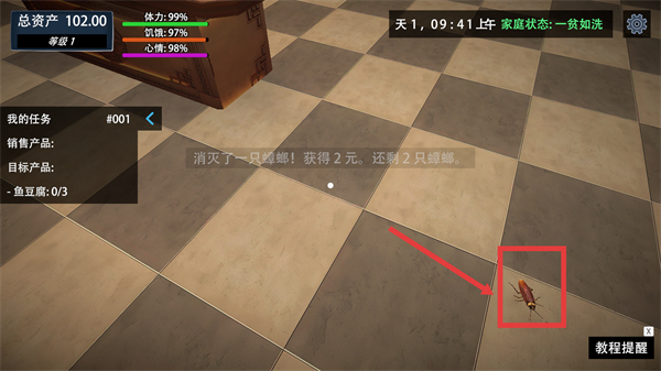 3、清理店内出现的蟑螂,每次消灭可获得2元奖励,剩余蟑螂继续处理,增加额外收入。
