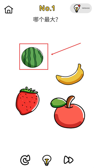 2、在“哪个最大?”题目中,选择【西瓜】选项即可答对,这类题目需对比物品实际尺寸来判断答案。