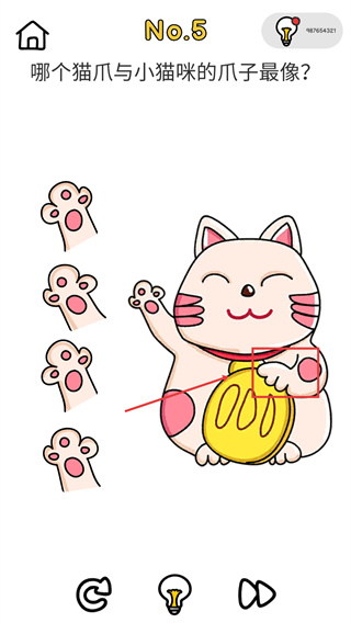 4、“哪个猫爪最像?”题目中,对比小猫咪的爪子特征,选择对应样式的猫爪选项即可完成答题。