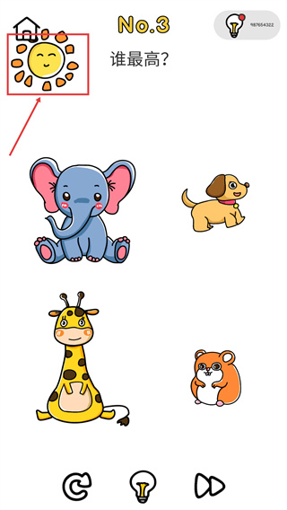 3、“谁最高?”题目里,【太阳】是正确选项,它的实际高度远超过画面中的动物,需跳出直观视觉判断。