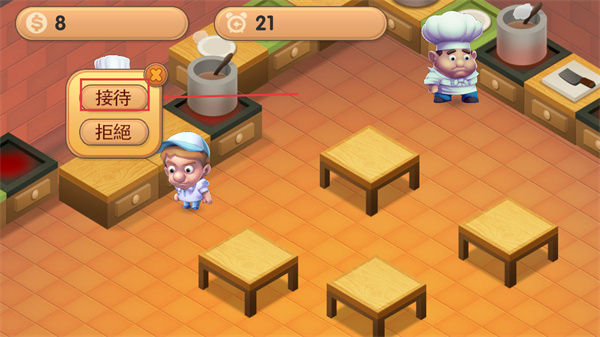 2、遇到顾客时点击【接待】按钮,可让顾客就座并触发点餐需求,是推进经营流程的基础步骤。