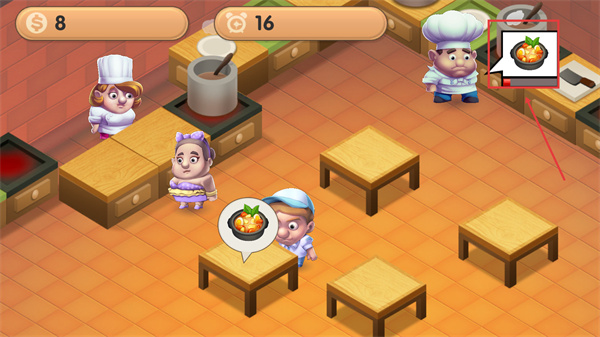 3、顾客点餐显示【菜品图标】后,需操控厨师制作对应菜品,完成后送达顾客以获取收益。