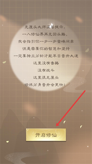 1、界面显示无厘头大师的提示,说明进入修仙界后需靠智慧与坚持晋升,点击底部【开启修仙】按钮即可进入游戏。