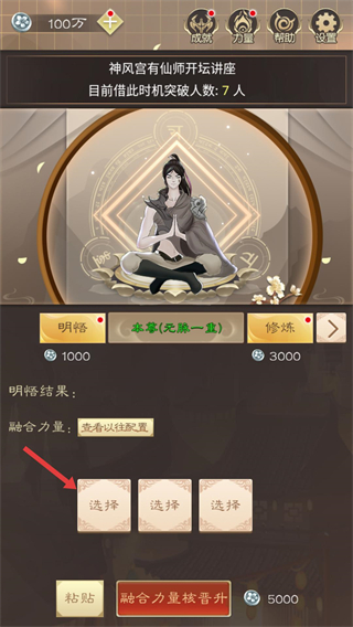 2、进入后显示神风宫仙师讲座的突破人数,当前角色处于【无脉一重】境界,能点击【选择】按钮进行后续操作。