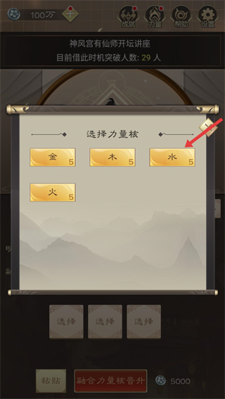 3、点击选择按钮后会弹出【选择力量核】界面,有金、木、水、火四种属性的力量核可选,选择对应力量核可用于后续的力量融合操作。