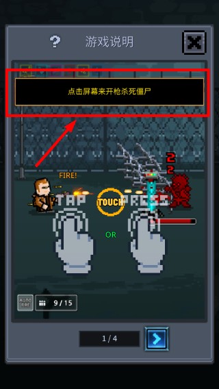1、点击屏幕开枪射杀防线外僵尸,可通过【FIRE】-【TOUCH】提示掌握基础射击操作。