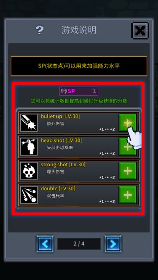 2、【SP】状态点可用于强化【bullet】-【headshot】等技能来提升战斗能力。