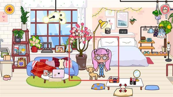 2、进入卧室场景后,可点击角色、宠物或物品(如笔记本电脑、化妆品),触发对应的互动动作。