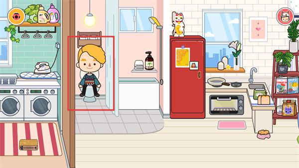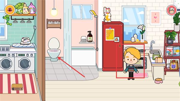3、切换到厨卫场景后,选中角色并拖动到目标区域(如马桶旁),可让角色进行对应行为互动。