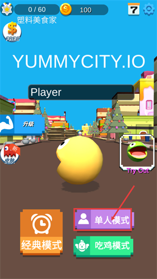 1、选择【单人模式】进入【YUMMYCITY.IO】玩法,初始拥有【100】金币,可通过吞噬场景物品来推进游戏进度。