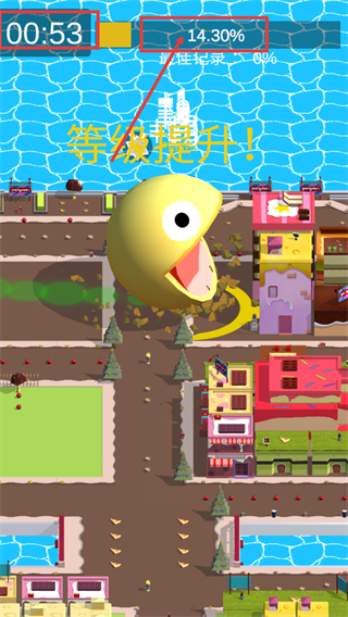 3、持续吞噬物品使进度提升至【14.30%】,满足条件后会触发【等级提升】,角色体型会增大,可吞噬的物品范围也会扩展。