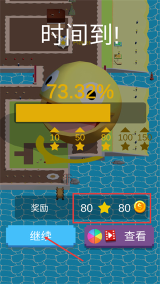 4、时间结束后,根据【73.32%】的进度可获得【80】星星与【80】金币奖励,点击【继续】可进入下一局游戏积累更多资源。