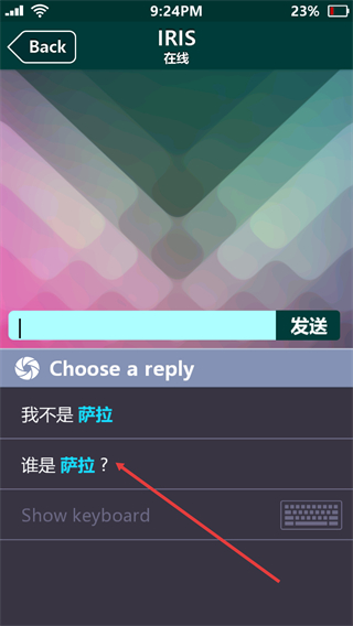 2、进入【IRIS】聊天界面后,点击底部输入框,可激活回复选项列表,准备选择互动内容。