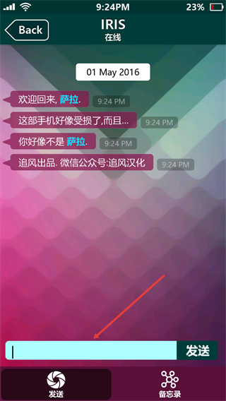 1、在手机桌面找到【IRIS】图标(带有未读标记),点击该图标可进入应用的互动聊天界面。