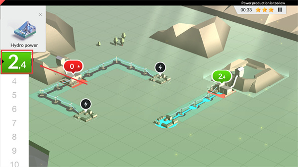 3、选择【Hydro-power】设施,将其部署到合适位置,可提升【2,4】发电数值,解决供电不足问题。