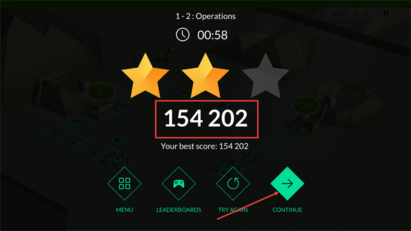 4、通关后查看【154-202】最佳分数,点击【CONTINUE】按钮进入下一关,可继续积累分数冲击更高评级。