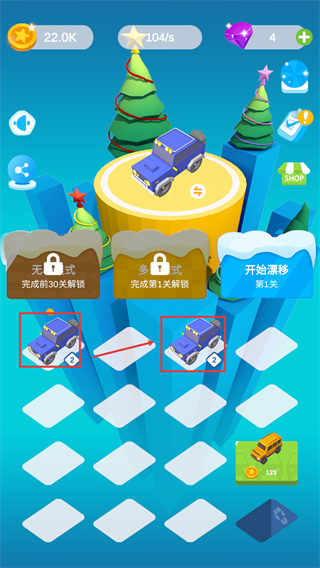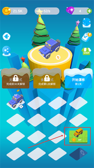 1、点击【开始漂移-第1关】进入关卡,同时可花费【107】金币解锁车辆。