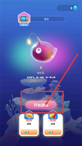 1、玩家登录后拥有速度与血量,点击【开始游戏】即可进入海洋世界开启进化之旅。