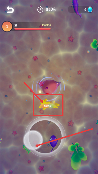2、拖动【白色透明圆盘】控制生物移动,吃掉黄色珊瑚积累游戏进度,助力生物完成初步进化。