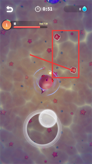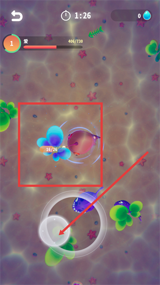 1、操控生物在斑斓海底穿梭,主动靠近并吞噬体型更小的生物,逐步积累成长所需的能量,推动进化进程向前。