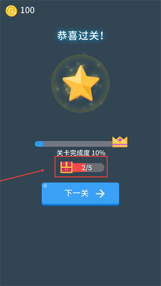 4、通关后可获得星级奖励,当前【宝箱进度2/5】,点击【下一关】可继续挑战,积累进度解锁更多奖励。