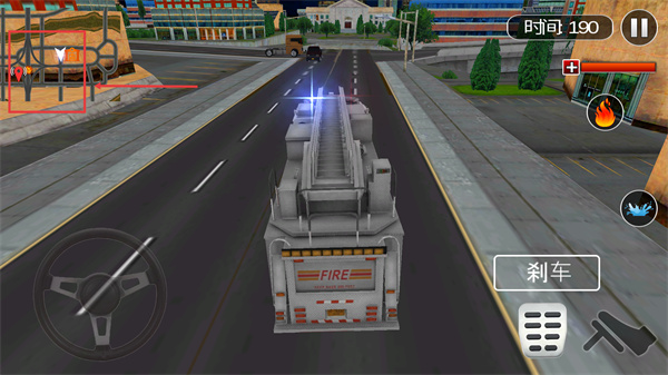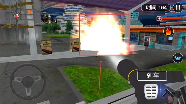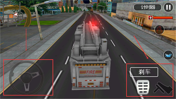 2、驾驶消防车时,用方向盘控制方向,结合【刹车】键调整车速。