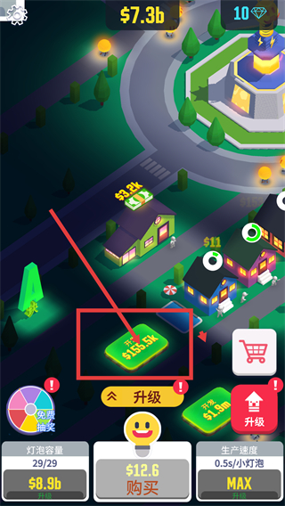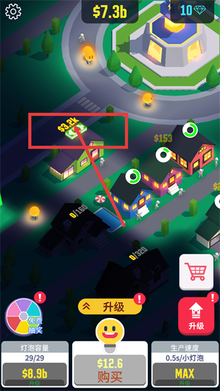 2、城市中自动生成金币堆,无需手动操作即可收集,积累资金用于后续灯泡和建筑升级。