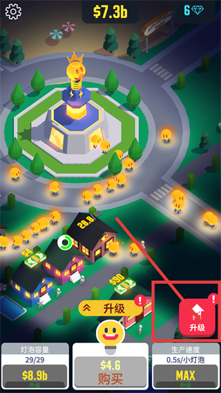 2、依靠自动收集的金币逐步解锁灯泡升级选项让点亮的速度与范围不断拓展。