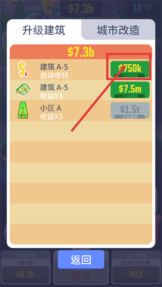 4、在升级建筑界面点击按钮,提升对应建筑收益,为城市点亮提供更充足的金币支持。