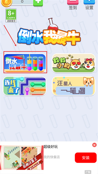 1、点击被框选的【倒水我最牛】图标进入关卡,该图标是对应玩法的入口。