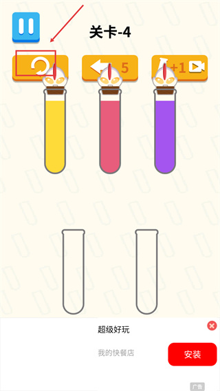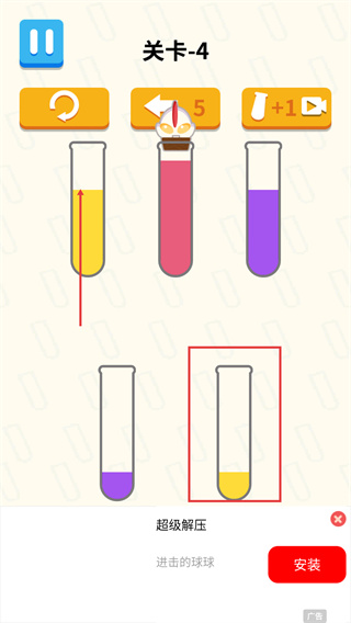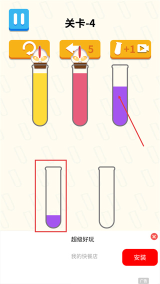 2、将装有黄色液体的试管倒入被框选的【黄色液体试管】,按同色液体归置的规则。