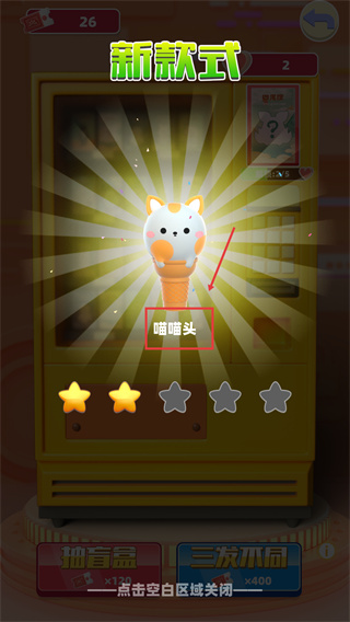 2、触发【新款式】时可获取【喵喵头】,通过【抽盲盒】类操作积累星级,解锁更多奖励内容。