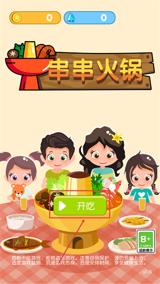 1、点击【开吃】按钮进入【串串火锅】玩法,初始金币与钻石均为0,后续通过关卡积累资源。