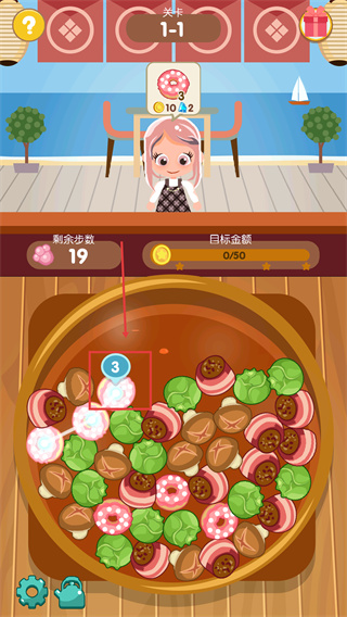 2、在【1-1】关卡中,优先消除标有数字3的食材,注意步数。