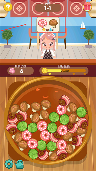 3、按顾客新需求消除【甜甜圈】与【香菇】类食材,向关卡目标推进。