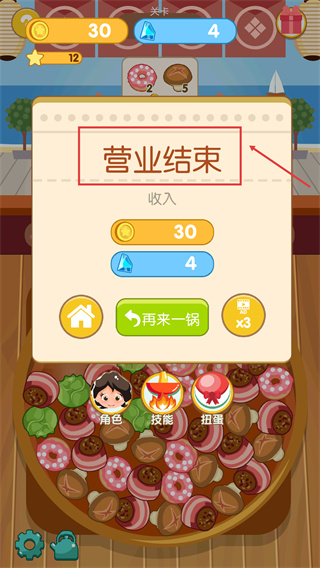 4、【营业结束】后可获得30金币与4钻石,点击【再来一锅】重复关卡。