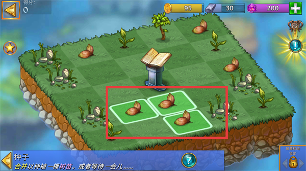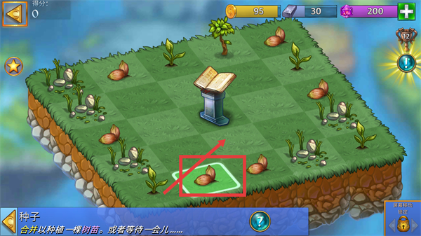 2、关卡内按提示将【种子】拖至指定位置,通过合并三个同类物品可生成【小树苗】,掌握基础合并操作推进游戏。