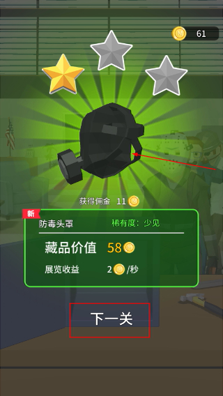 4、成功开锁后获得【防毒面罩】这类藏品,它有展览收益,点击下一关继续挑战新锁。